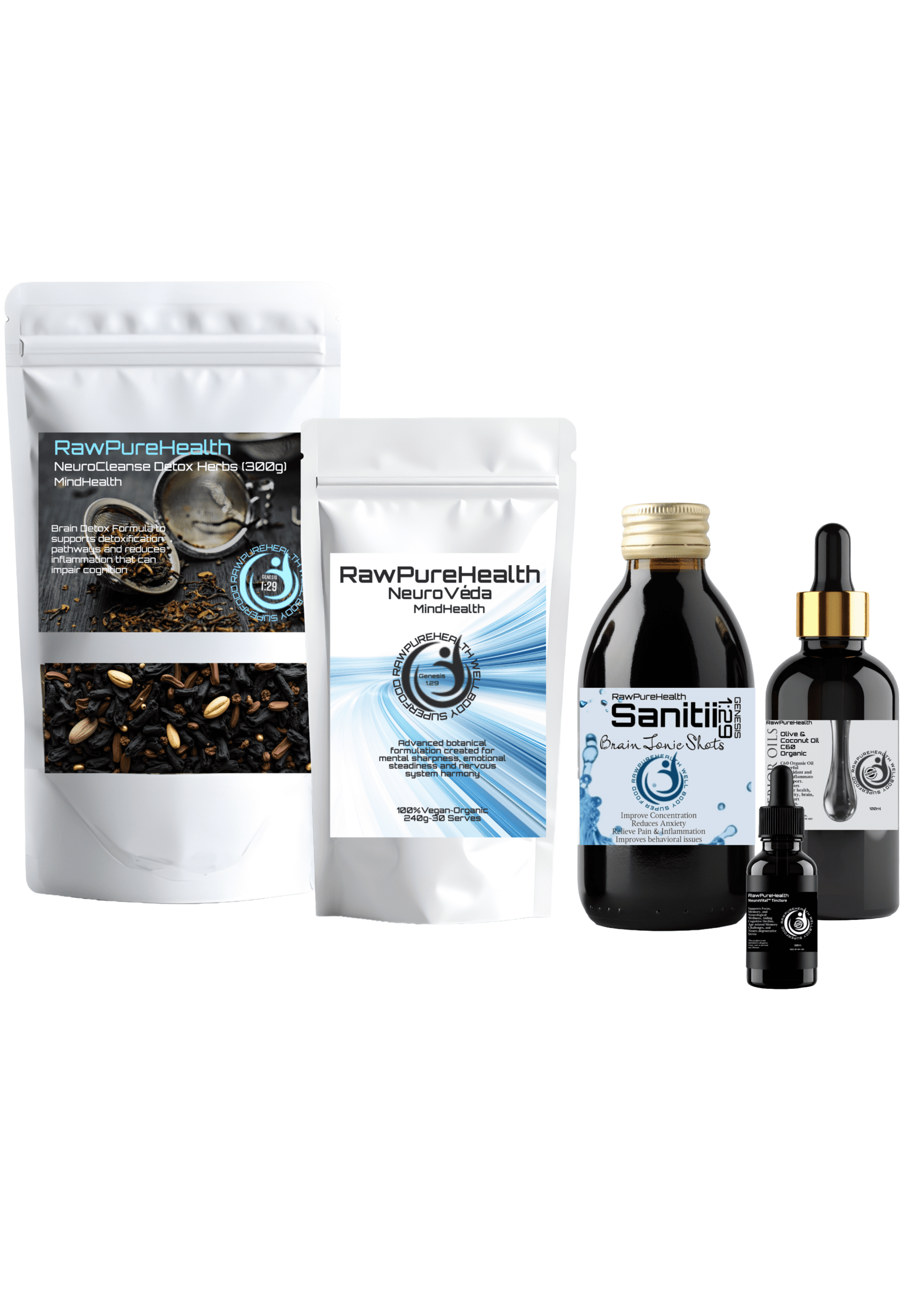 At the heart of the stack is the Sanitii™ Elixir (300ml), a premium brain tonic, supported by detoxification herbs, botanical powders, advanced antioxidant oils, and targeted neurological tinctures to provide full spectrum brain support and neuroprotection.